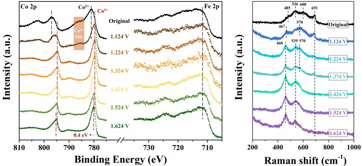 该研究成果从电解水制氢的产业化应用角度出发,发展了低成本、实用性强的机械搅拌技术来可控合成羟基氧化铁与氢氧化钴的微米片阵列结构,借助表面铁位点的原位溶解和沉积来调控催化材料的活性组分,实现了钴铁基析氧催化剂在高电流密度500 mA/cm2下长时间持续运行超过150小时,展现出优异的稳定性,其析氧过电位只增加30毫伏左右,这为碱性电解水制氢技术的工业化提供了新思路。在此基础上,团队创新催化机理解析思路,率先发展了以X射线光电子能谱为主、拉曼光谱为辅的原位谱学表征技术,实时监测到钴铁催化剂的动态结构重构行为,解析了铁元素在析氧活性物种演化过程中的主要影响机制,并采用密度泛函理论计算阐释了可能的析氧活性位点。