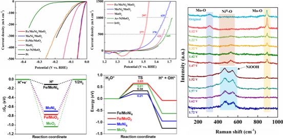 针对上述问题,该团队通过在金属间化合物MoNi4表面原位锚定铁颗粒的策略,开发出一种多金属位点接力催化的Fe/MoNi4/MoO2双功能电解水催化剂。MoNi4促进初始的水吸附/解离步骤,Fe/MoNi4加快后续的氢吸附步骤,而表面重构形成的Ni1-xFexOOH则主要促进水氧化步骤,进而显著降低全解水反应过程中涉及的多个决速步骤的能垒。该催化剂在碱性环境中表现出优异的双功能活性和大电流密度下的长期稳定性,分别仅需要59mV和277mV的析氢和析氧过电位就能产生500mA/cm2的工业级电流密度,其性能优于绝大多数非贵金属催化剂。将其耦合成全解水器件,该器件仅需要1.64 V的槽压就能产生安培级电流密度1000 mA/cm2,且在大电流密度500 mA/cm2稳定运行200小时以上。在此基础上,团队利用原位X射线光电子能谱、原位拉曼光谱和密度泛函理论计算解析了催化剂中多级界面之间的协同催化效应以及多金属位点的协同接力催化机制。该研究为开发工业级双功能电解水催化剂提供了技术指导。